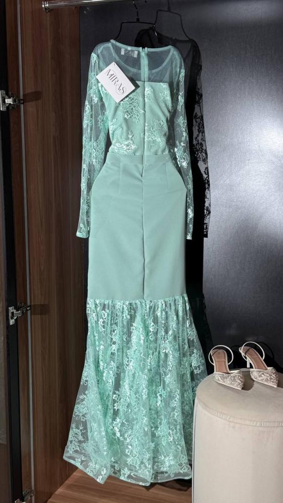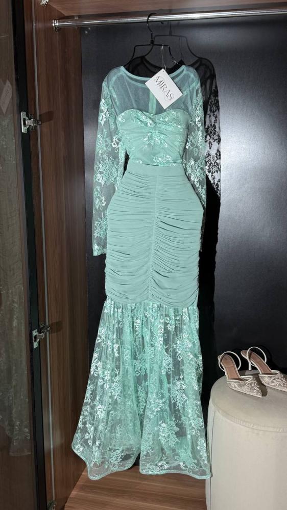 هذا الفستان يجمع بين الفخامة والرقي بتصميمه الساحر من قماش الدانتيل الفاخر باللون الأخضر الباستيل الهادئ. الأكمام الطويلة الشفافة المصنوعة من الدانتيل تضيف لمسة أنثوية حالمة، بينما يبرز التصميم الكورسيه العلوي تفاصيل الجسم برقي.