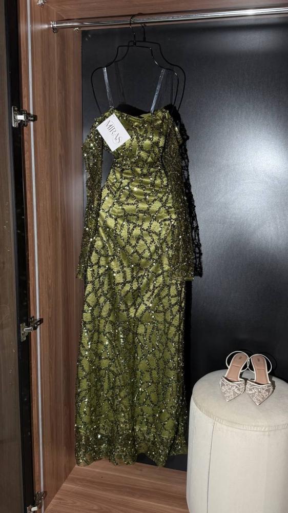 تميزي بإطلالة تخطف الأنظار مع هذا الفستان الطويل من MIRAS باللون الزيتوني الفخم المرصّع بتطريز لامع متداخل مع خامة غنية تعكس الضوء بحركة ساحرة.
