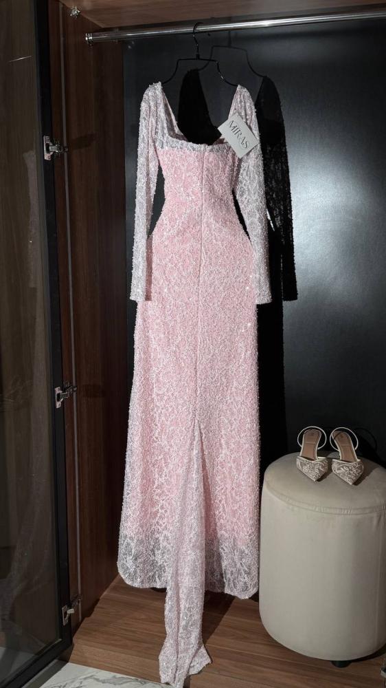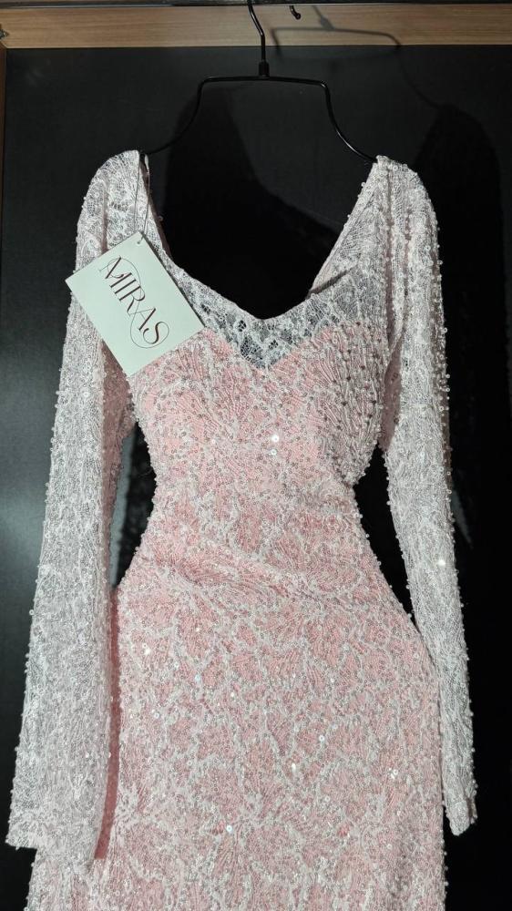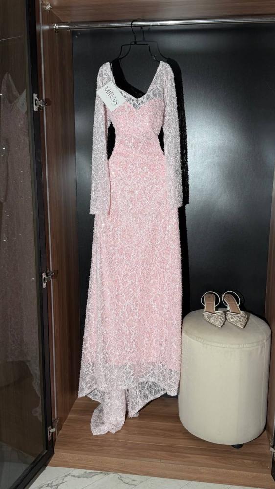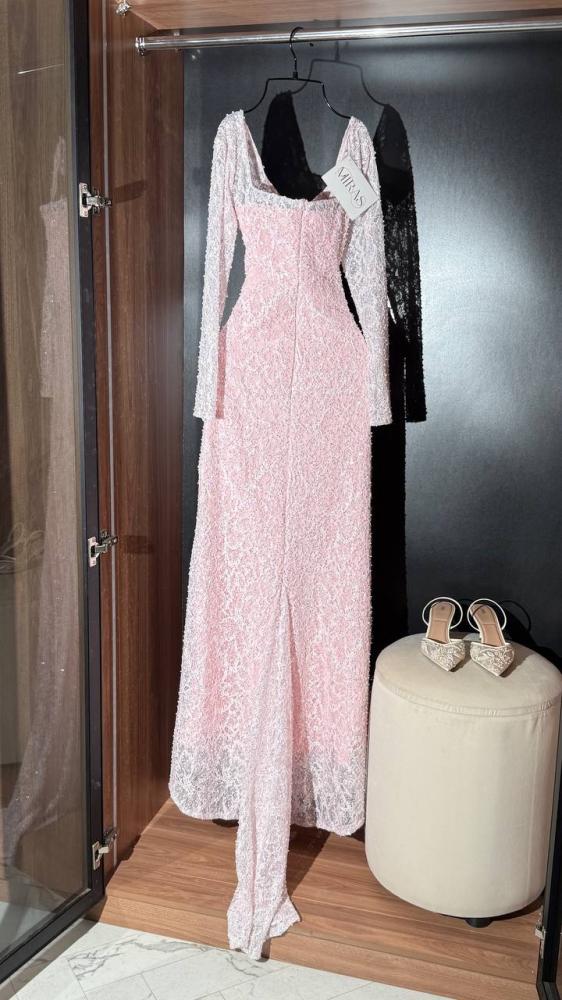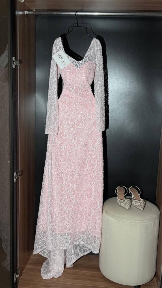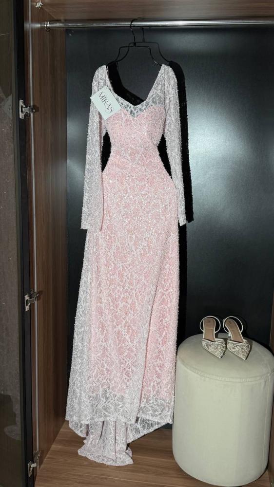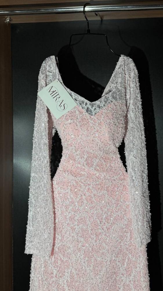 يأتي بلون وردي باهت مزدان بتطريز يدوي دقيق من الخيوط اللامعة والترتر الأبيض، ما يمنحه بريقًا راقيًا يظهر مع كل حركة. الأكمام الطويلة الشفافة والدانتيل الفاخر تضيف لمسة حالمة من النعومة والرقي.