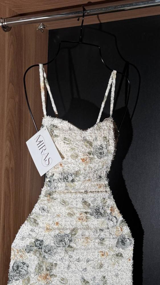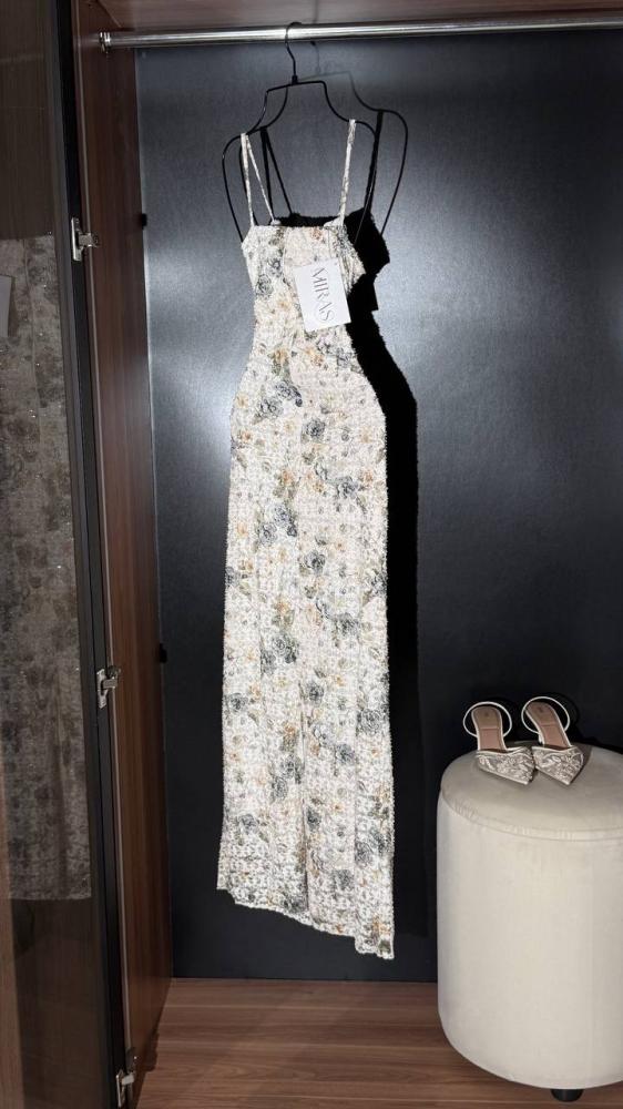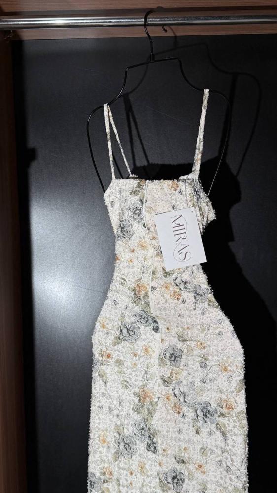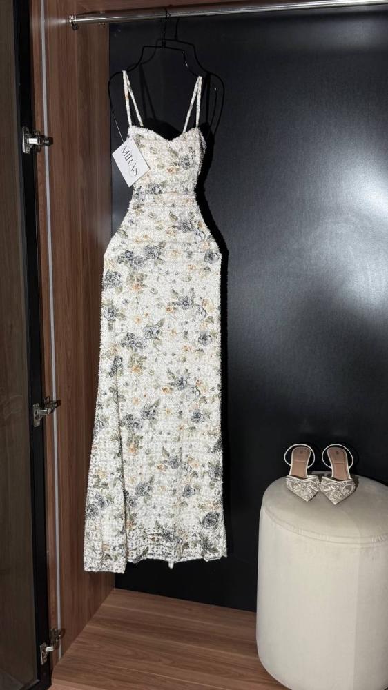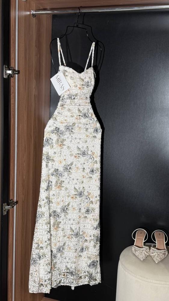 هذا الفستان الطويل بتصميم بديع يجمع بين النعومة والفخامة. مصنوع من قماش فاخر مطرز بالكامل بنقوش ورود متداخلة بألوان هادئة (الرمادي، الأخضر الزيتوني، والذهبي الفاتح) تضفي لمسة طبيعية أنيقة. القصة ضيقة عند الخصر لتبرز جمال القوام، مع حمالات رفيعة تضيف لمسة أنثوية ناعمة.