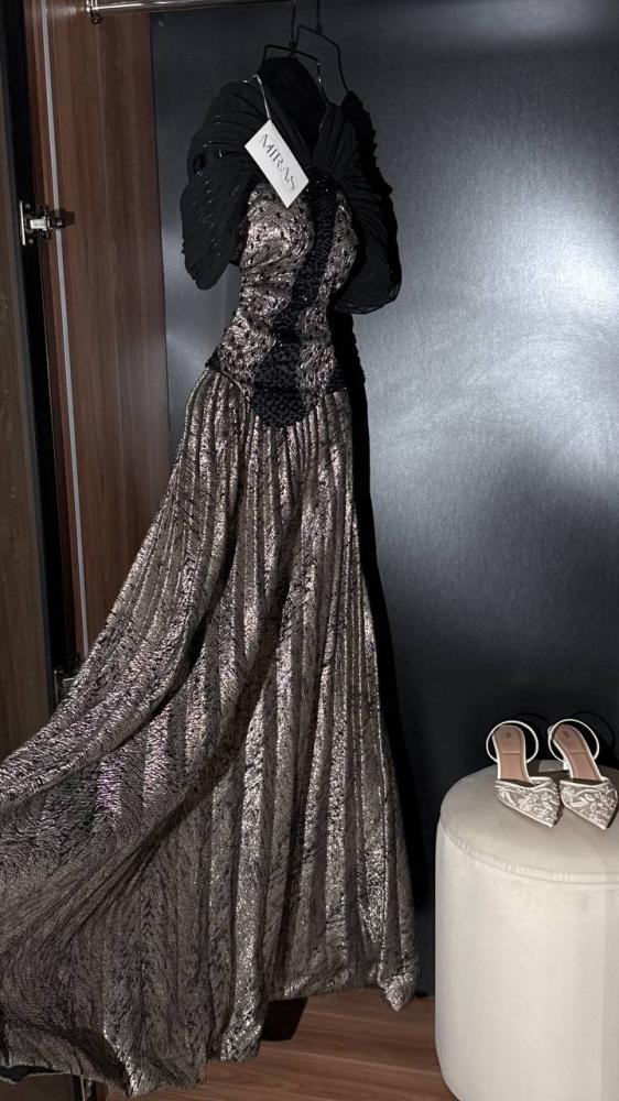 صُمّم هذا الفستان من قماش ميتاليك فاخر بلونٍ فضيّ متدرّج يتوهّج مع كل حركة، مع كورسيه أسود يبرز الخصر ويعكس أنوثة آسرة.